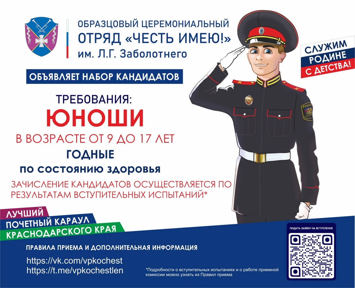 📣📣📣📣📣🤩 🇷🇺НОВЫЙ НАБОР🇷🇺 ▶️ Мечтаешь стать кадетом, тогда эта информация для тебя! 🤩 С 2022 года Церемониальный отряд «Честь имею!» является КАДЕТСКОЙ ОРГАНИЗАЦИЕЙ!!! Мы объявляем о приеме документов от кандидатов!!! 👮♂️Если тебе от 9 до 17 лет, ты мечтаешь о погонах и карьере военного, то наше объединение это первый шаг на этом ответственном пути! Набор будущих кадет ведется по следующим направлениям: 🇷🇺 Группа развертывания флага\Знаменная группа (13-17 лет) 🪖 Взвод почетного караула (Группа карабинеров) (13-17 лет) 🥁Взвод барабанщиков (11-15 лет) 👮♂️Подготовительная группа (Общая строевая подготовка) ( 9-12 лет) 🫡Все воспитанники изучают основы начальной военной подготовки. ‼️Принимаются только ЮНОШИ!‼️ 🗓 О дате проведения вступительных испытаний будет сообщено дополнительно. ☎️ Остались вопросы, звони: +79530802115 📝 Заполняй анкету* кандидата и жди приглашение на собеседование! * Перед подачей заявки ознакомьтесь с Правилами приема! ` *Контроль