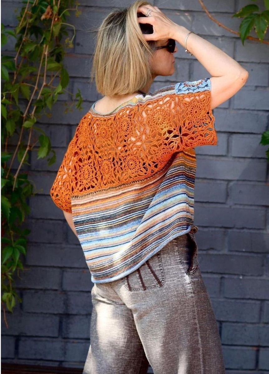 Многими очень любим узор для вязания "Бабушкин квадрат" и вот он нашел свое применение в современном исполнении. Отличное сочетание вязания крючком и спицами... ... лицевая гладь не создаст проблем в исполнении , а ажурный "Бабушкин квадрат придаст изделию легкость и воздушность. Если подобрать пряжу с легким блеском, то получится вечерний наряд. Можно будет дополнить этот джемпер каким-нибудь украшением. Рисунок выбран самый простой, так что вязать можно будет даже по дороге в отпуск например))) Как вы сами видите - выбор пряжи дает разные варианты, этот хлопковый джемпер будет хорош в летнюю погоду. Но если вам нравиться полностью ажурные джемпера, то можно его связать только из узора "Бабушкин квадрат", не использую спицы. На лето с джинсами будет очень уместно! Легкие летние топы из хлопковой пряжи, которые можно связать без подробного описания. Идеи для вдохновения. Самые простые вязанные формы трансформируются в изящные изделия от 40 до 70 размера. Идеи для вдохновения! Джинсовы