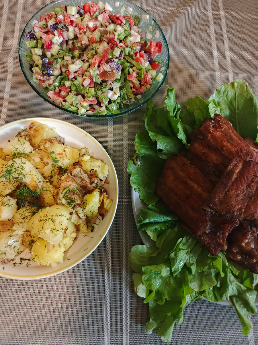 Здравствуйте! Хотела я появиться в воскресенье, но Дзен в который раз штормило, а меня не пускало в студию никак. А показать наши ужины все-таки хочется. Я уже говорила, почему я люблю лето? Да, это куча овощей и зелени! Кто-то скажет, что это все и зимой найти не проблема. Но ни один тепличный помидор не сравнится по аромату, вкусу и пользе с домашним! Мы без устали рубим салаты из всего, щедро заправляем все сметаной, запекаем молодую картошечку и радуемся жизни. Итак, покажу, что именно я готовила всю неделю. Напомню, что это ужин для меня одной или нас с мужем, сын гостит у родителей. Мы продолжаем лакомиться запеченными ребрышками. Нашли магазин, где точно молодые и свежие ребрышки уже в маринаде. Пробовали покупать где-то еще, но это совсем не то. Ребрышки я запекаю в фольге в духовке. Картофель сначала отварили, потом чуть поджарили. А салат - это произведение мужа. Именно он любитель накрошить все меленько. На этот раз в салате помидоры, огурцы, болгарский перец, репчатый лук,