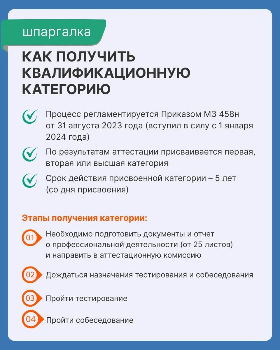 Шпаргалка: как получить квалификационную категорию •Процесс регламентируется Приказом МЗ 458н от 31 августа 2023 года (вступил в силу с 1 января 2024 года). •По результатам аттестации присваивается первая, вторая или высшая категория. •Срок действия присвоенной категории – 5 лет (со дня присвоения). Этапы получения категории: 1 Необходимо подготовить документы и отчет о профессиональной деятельности (от 25 листов) и направить в аттестационную комиссию. 2 Дождаться назначения тестирования и собеседования. 3 Пройти тестирование. 4 Пройти собеседование. МЕДИАТОР Лицензия, ФИС ФРДО. Официальный провайдер портала НМО. Наш сайт: https://mediator-med.ru Телефон: 88001007226 Задать вопрос: @anna_nmo @nmo_akkred