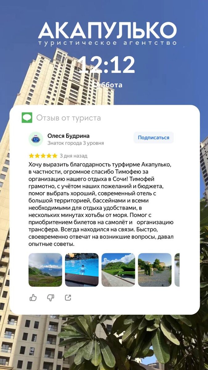 Мы благодарим Вас за то, что делитесь своими впечатлениями об отдыхе и о нашей работе