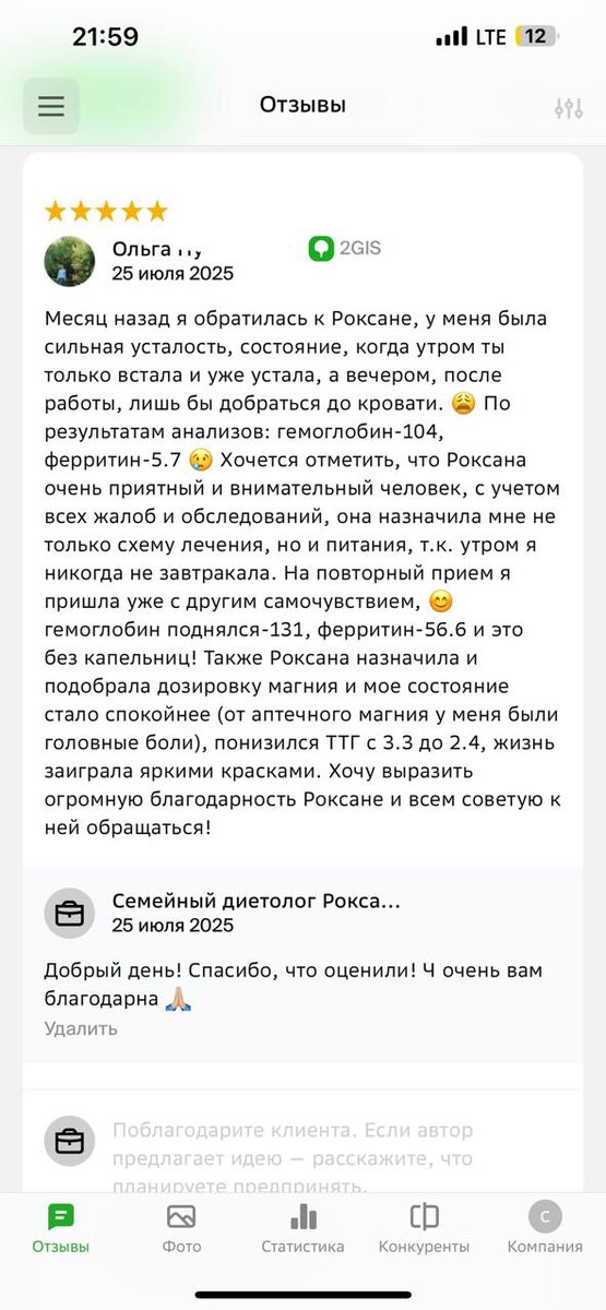 Вот такой отзыв вчера оставили после приема. Пациента счастлива, я довольна 😊