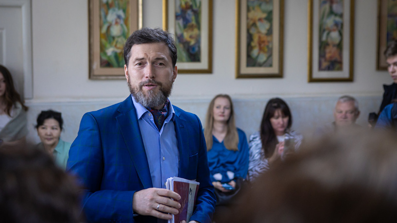 В большом холле нас встречает взрослый мужчина. Из-под классической рубашки нежно-голубого цвета выглядывает изящный шарф в фиолетовых тонах. Он приветливо улыбается и помогает сориентироваться в пространстве.