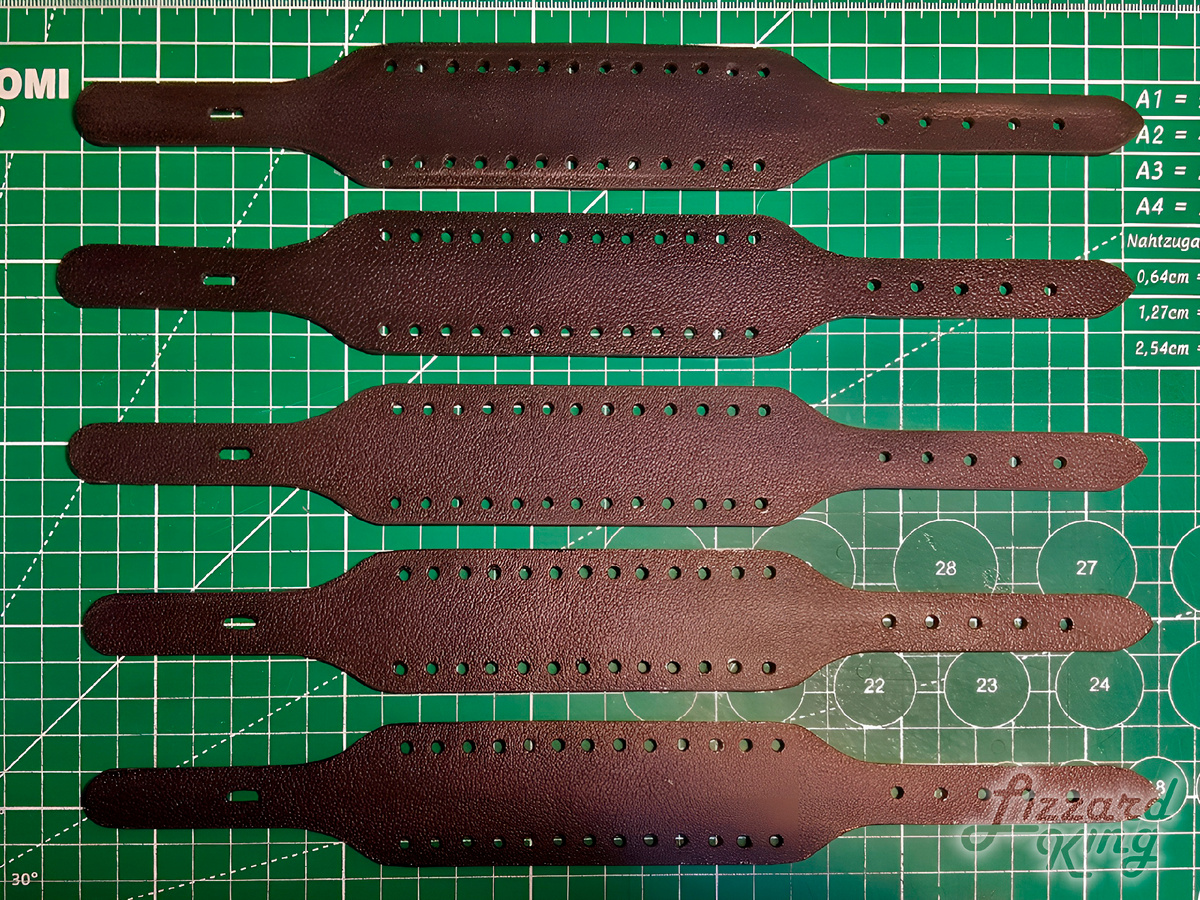 Примерно месяц назад у меня появилась заявка на целый комплект браслетов для рок-группы "Аварийный Выход 54" из Новосибирска. Идея для формы пришла достаточно быстро – недавний широкий браслет "Инь-Ян" по форме замечательно подходил для рокеров. Я включил музыку группы и приступил к работе. Первым делом я склеил листы кожи шевро (снаружи) и овчины (внутренняя часть). Разметил форму терморучкой и взялся вырезать. Но натуральная кожа она потому и натуральная, что имеет свои индивидуальные детали, в частности на линии реза она может начать махриться. Чтобы этого не было, на урез я нанёс смесь восков и смол, которую позже глубоко и настойчиво втёр. Дальше, из склейки овчины в два слоя я нарезал десять тридцатисантиметровых лент (по две для каждого браслета), также обработал их воском и взялся вплетать. Получившиеся заготовки я немного запрессовал, чтобы придать им ровную и аккуратную форму. И к этому моменту ко мне пришёл новый лист нержавеющей стали, заранее отполированный поставщиком д