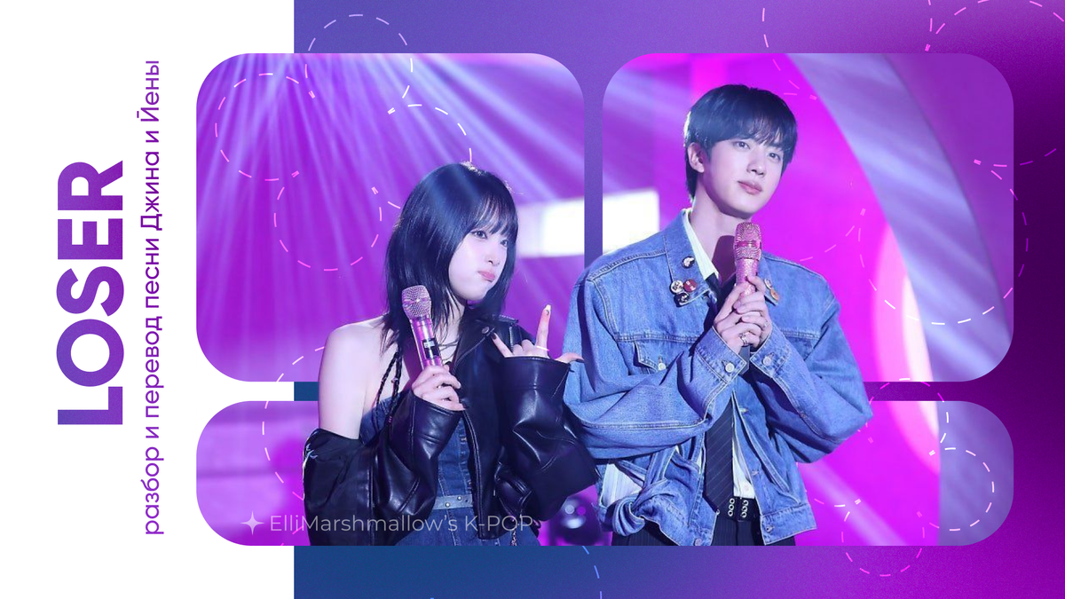 За последний год старший участник BTS Джин порадовал своих поклонников (и меня в их числе) аж двумя сольными альбомами. Это Happy (счастливый) выпущенный в ноябре 2024 года, и ECHO (Эхо), выход которого состоялся в мае 2025. И чем дольше я слушаю их (а это происходит на ежедневной основе), тем более счастливым по звучанию мне видится как раз ECHO. И это на самом деле занятное дело! Не буду углубляться в это сильно в конкретной статье, но обязательно порассуждаю об этом в обозримом будущем, а пока… А пока я хотела бы познакомить вас с одной из самых веселых песен с альбома Джина ECHO под названием Loser. Эта песня – единственный дуэт на указанном альбоме, и была исполнена вместе с сольной исполнительницей Чхве Йеной, или YENA, участницей проектной группы IZ*ONE. Еще до релиза, как только появились новости об ее участии в записи песни, я успела написать обзорную статью, посвященную Йене в целом, так что советую прочесть: Если вкратце, приглашение этой артистки в альбом было не случайным
