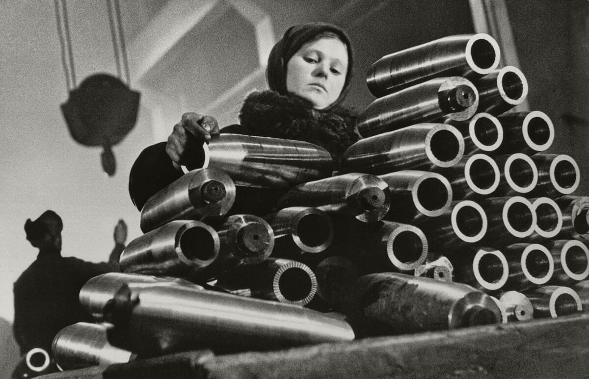 История в фотокадрах. В цехе завода. Девочка укладывает болванки снарядов, 1942 г. Автор: Всеволод Тарасевич 💛 Подвиг.РФ | Поддержать канал голосом #подвигрф #фотоистория #историческоефото