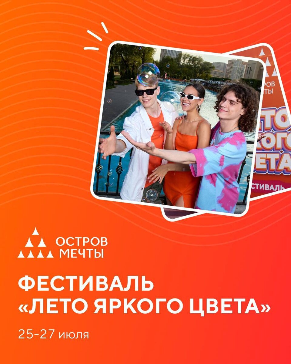 🆓🎉 Фестиваль «Лето яркого цвета» в самом разгаре @dreamislandmsk ⠀ 🗓️25-26 июля 📍«Остров Мечты» в Южном ландшафтном парке! 🤩 ⠀ В программе: интерактивный спектакль Перо Жар-Птицы, функциональная тренировка Booty Burn, шоу мыльных пузырей, роспись хной, DJ set, мастер-класс «Бутылочки с цветным песком» и многое другое! ⠀ При плохих погодных условиях активности будут перенесены в городской променад на площадь «Москва» 🎵 ⠀ 🆓Бесплатно Подробнее ЗДЕСЬ @Together_with_kids Пост носит информационный характер