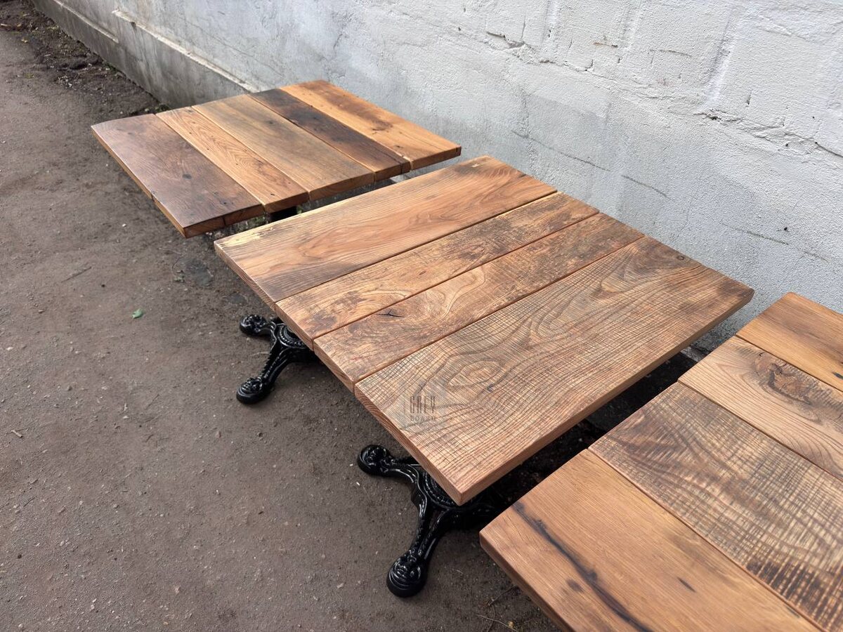 Металлические основания — литые, устойчивые, идеальны для ресторанного потока. А благодаря профессиональной обработке и маслу столы готовы к сезону под открытым небом.