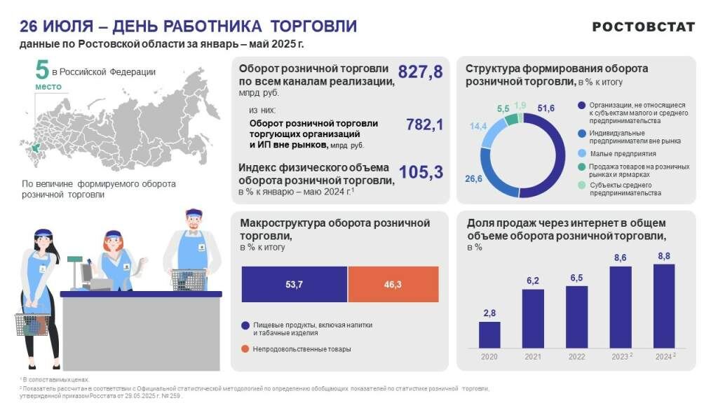Ростовская область уже много лет входит в первую десятку субъектов России по объему розничной торговли. В 2024 году наш регион занял пятое место. За первые пять месяцев 2025 года оборот розничной торговли вырос на 5 % по сравнению с тем же периодом прошлого года и составил 827,8 миллиарда рублей. Эти данные приводит Ростовстат, подводя итоги к профессиональному празднику работников торговли. Основную часть розничного товарооборота — 53,5 % — формируют крупные и средние предприятия. На долю крупных торговых сетей приходится около 30 % продаж. Торговля по-прежнему привлекает малый бизнес. В Ростовской области зарегистрировано более 47 тысяч малых предприятий, которые обеспечивают более 38 % регионального товарооборота. С каждым годом растет популярность онлайн-покупок. В прошлом году доля интернет-торговли составила 8,8 %. Жители Ростовской области также активно посещают рынки и ярмарки, где совершают 5,5 % розничных покупок. В сфере розничной торговли Ростовской области заняты более 300