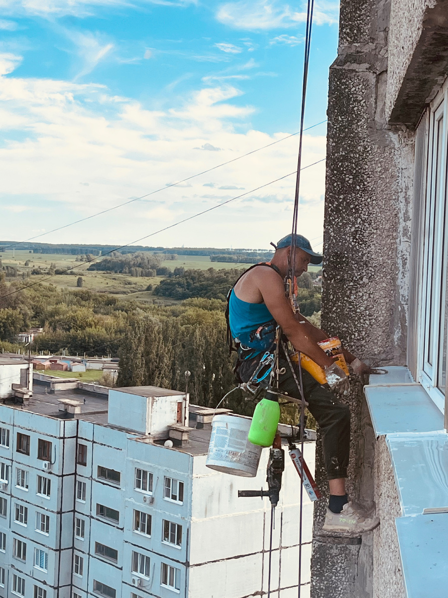 Вот вчера я с таким познакомилась) И не просто где-то.. он висел на стене моего дома, на уровне 14 этажа часа три с лишним. Прям на стене моей квартиры, и под окнами.. А все дело в том, что у меня в квартире потекли швы. И потекли они не вчера и не сегодня, а с прошлого года как минимум. Когда я впервые увидела в одной из спален, где наружная стена, мокрые обои, я очень расстроилась. 😡 Тем более что такая проблема у меня уже была много лет назад, еще в начале двухтысячных. Вообще дом, в котором я живу, очень старый. Я приехала в Курчатов в далеком 1983 году, и это дом уже был, когда его построили, я даже не знаю. Сама живу в нем с 1996 года. И вот в 2003 у меня потек шов в спальне. Я тогда вызвала к себе домой наше местное телевидение, 🎥📺 тогда еще у нас была съемочная группа. Они пришли, сняли репортаж, я «зазвездилась» 🤩 на экране и это помогло. Пришли с управляющей компании и шов мне заделали. Но вот как и кто тогда лазил на стену, я честно говоря не помню.. двадцать лет п