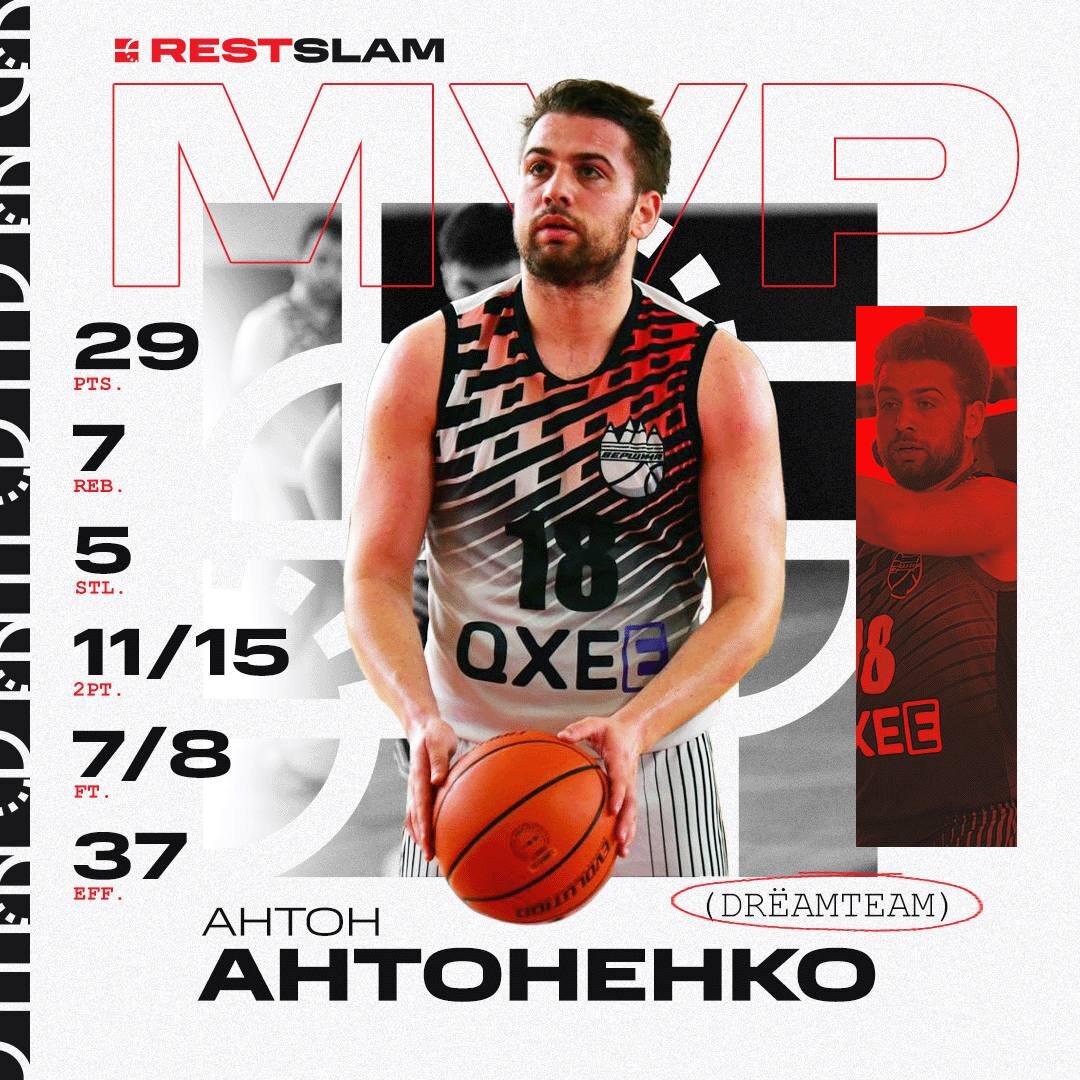 MVP ABL Rest Антоненко Антон (Вершина) vs DrёamTeam Rest Slam 68:54 29 очков, 7 подборов, 5 перехватов, 11/15 2-очковые, 7/8 штрафные, 37 эффективность Вершина проиграла первую четверть DrёamTeam 8:16, а потом Антоненко набрал 13 очков, реализовав 5 из 5 двухочковых и 3 из 3 штрафных бросков. Антон помогал команде на обеих сторонах площадки, координируя действия команды в защите и нападении. Также Антоненко помог закрыть четвертую четверть, набрав 8 очков. Благодаря уверенному выступлению Антоненко Вершина одержала вторую победу в Slam. 1️⃣@ABL Moscow
