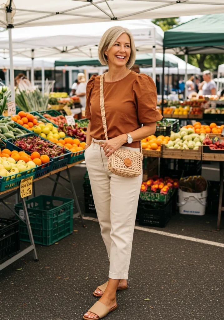 А светлые прямые брюки длиной до щиколотки вытягивают силуэт и выглядят легко и свежо. Плетёная сумка и бежевые шлёпанцы не спорят с цветами, а добавляют ощущение курортной непринуждённости. Такой образ легко представить на прогулке по рынку, в отпуске или за городом.