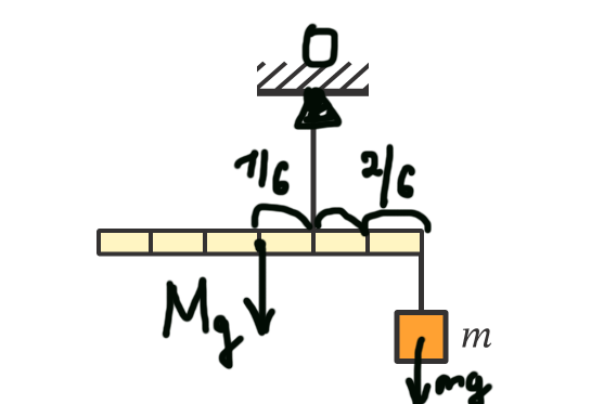 Определите массу однородного стержня, если масса груза m=200 г. Система находится в равновесии. Ответ дайте в г, округлив до целого числа 1/6Mg=2/6mg M=2m Ответ 400 Найдите силу натяжения верхней нити, если ускорение свободного падения g=10 Н/кг. Ответ дайте в Н, округлив до целого числа. (M+m)g=0.6*10=6 Ответ 6 Вертикальная нить и подставка поддерживают однородный стержень массой M в горизонтальном положении так, как показано на рисунке. Размеченные части стержня имеют одинаковую длину. Пусть T — сила натяжения нити, N — сила реакции подставки на стержень, g — ускорение свободного падения. Определите силу натяжения нити, если масса стержня M=300 г. Ответ дайте в Н, округлив до десятых. Ускорение свободного падения g=10 Н/кг. Возьмём за точку отсчета подставку. Тогда 3Mg=5T T=3/5Mg Ответ 1.8 Найдите силу реакции треугольной опоры. Ответ дайте в Н, округлив до десятых. Возьмём за точку отсчета крепление нити. Тогда 2Mg=5N N=2/5Mg Ответ 1.2 При каком отношении массы однородной доски к ма