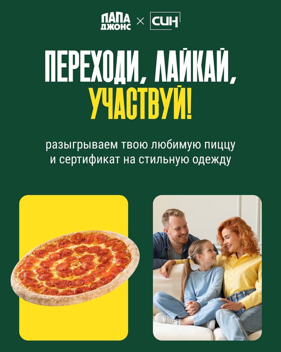 Папа Джонс и СИН объединились, чтобы устроить для тебя горячий конкурс: разыгрываем пиццы и сертификаты на стильную одежду 🔥 Что можно выиграть? 🥇 3 любые пиццы 40 см на традиционном тесте + сертификат в СИН на 5000₽ 🥈 2 любые пиццы 40 см на традиционном тесте + сертификат в СИН на 3000₽ 🥉 1 любую пиццу 40 см на традиционном тесте + сертификат в СИН на 1000₽ Как поучаствовать? 1. Подпишись на Папа Джонс и СИН 2. Лайкни любой пост 3. Нажми на кнопку «Участвовать» Уже 1 августа мы выберем трех победителей с помощью рандомайзера. Не пропусти шанс — и вкусно поужинать, и обновить гардероб 🍕👖 Правила розыгрыша можешь найти по ссылке