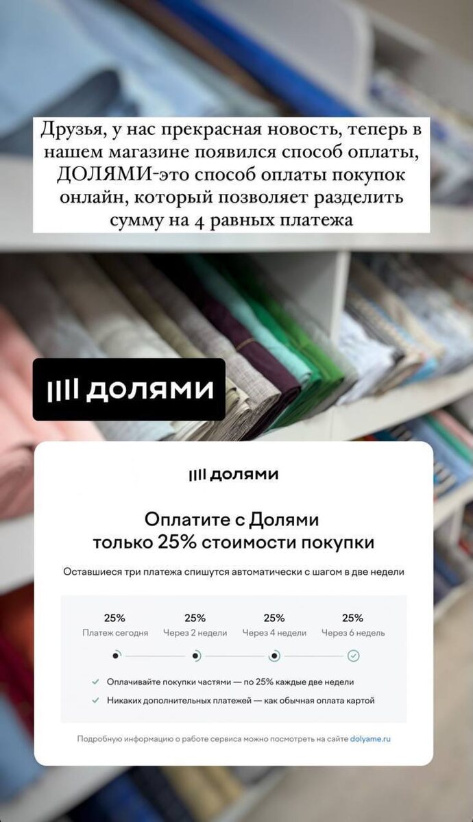 Друзья, у нас прекрасная новость! В нашем магазине появился удобный способ для оплаты онлайн покупок «Долями». У Вас есть возможность оплачивать товар через сервис долями, т.е Вы оплачиваете 25% от стоимости и мы сразу отправляем Вам заказ! И раз в 2 недели платёж автоматически списывается Вашим банком .