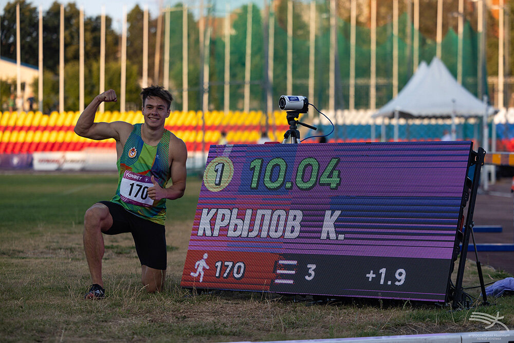 Уже в июне на Мемориале Знаменских Крылов бежал за 10,14, а его тренер Сергей Пантелеев говорил о цели побить рекорд на взрослом чемпионате в Казани.