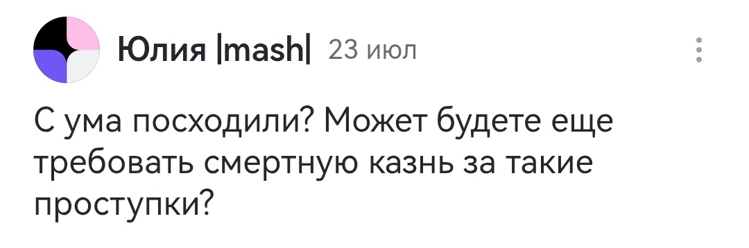 Видите ли, Юля, я действительно считаю, что в некоторых случаях смертная казнь не помешает. Чтоб неповадно было, да и нет ничего лучше карательного инструмента. История человечества такова, что именно там, где жёсткий институт наказания, там меньше всего преступлений. Рост преступности растёт обратно пропорционально уменьшению наказания. То есть, чем лояльнее наказания, тем выше преступность. Конечно, полностью преступность не искоренить и она будет всегда, но при более жёстких законах её меньше.