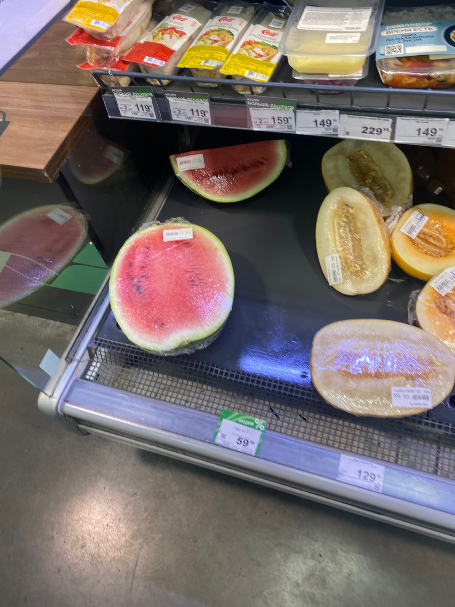 Сейчас цена уже 59 рублей в других магазинах. Часто беру половинками. Потому что мужа постоянно нет дома, а тащить целый арбуз с магазина у меня нет желания.