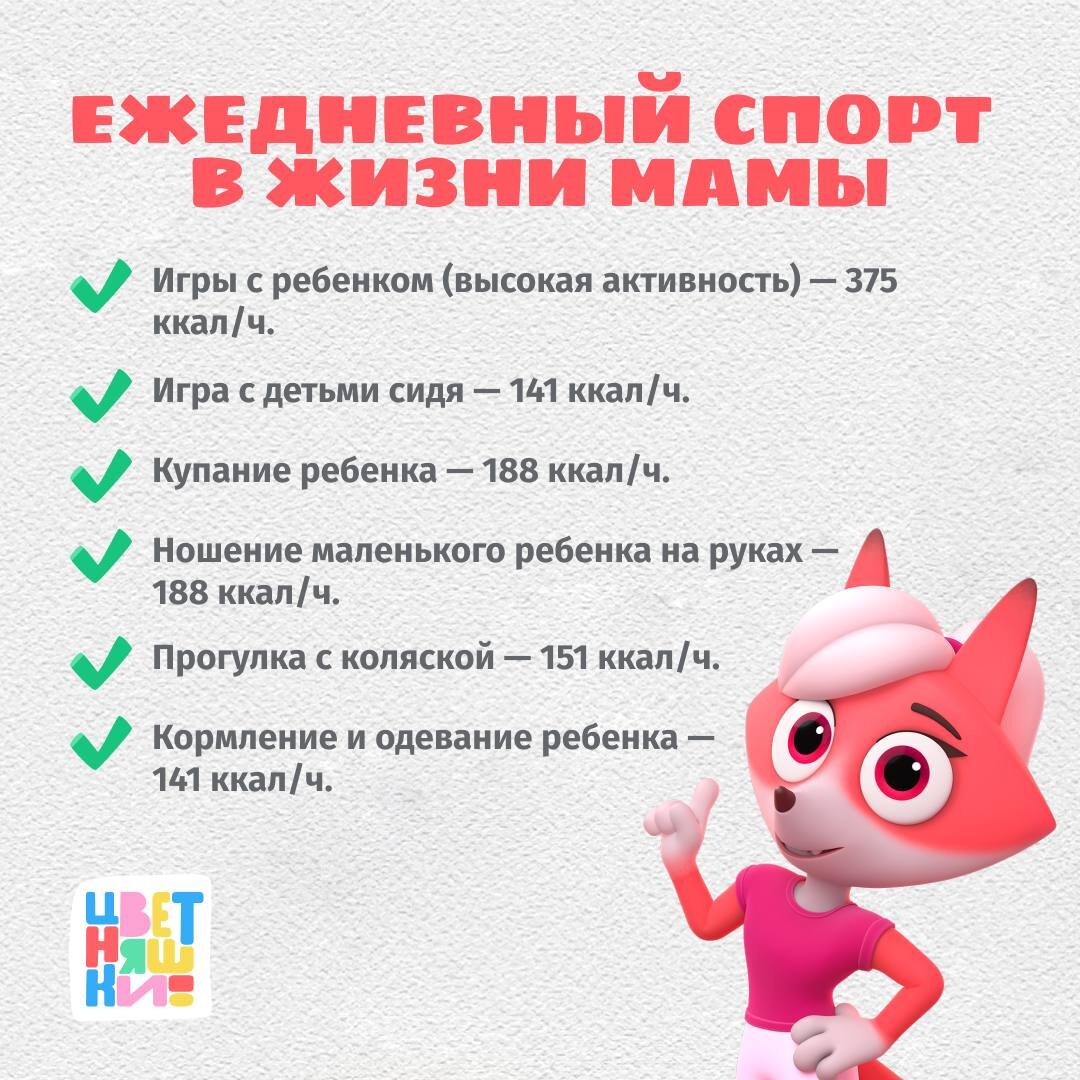 Топ-10 идей для спортивных игр с малышом от Цветняшек😉 Смотреть новый сборник: 🟡в ВК 🟡на RuTube 🟡на YouTube И, кстати, если вы сейчас подумали, что вам тоже не помешало бы добавить спорт в жизнь, то хотим вам напомнить одну вещь😅 Если вы мама — спорт преследует вас каждый день: ✔️уборка игрушек — тренировка на гибкость; ✔️прогулка с коляской — кардио на свежем воздухе; ✔️танцы под мультики — зумба, но веселее; ✔️подъёмы ребёнка 185 раз в день — силовая без перерыва; ✔️перепрыгивания через конструктор — кроссфит, но опаснее. Спорт — это не только штанги и кроссовки. Иногда это просто день из жизни мамы❤️