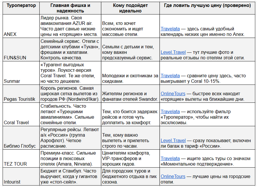 Чтобы вы не тратили время на чтение всех нюансов, я подготовил шпаргалку-рейтинг на 2026 год. В ней — коротко о том, кого выбирать под ваши цели (семья, экономия или VIP) и на каком сайте лучше всего искать туры конкретного оператора, чтобы поймать минимальную цену.