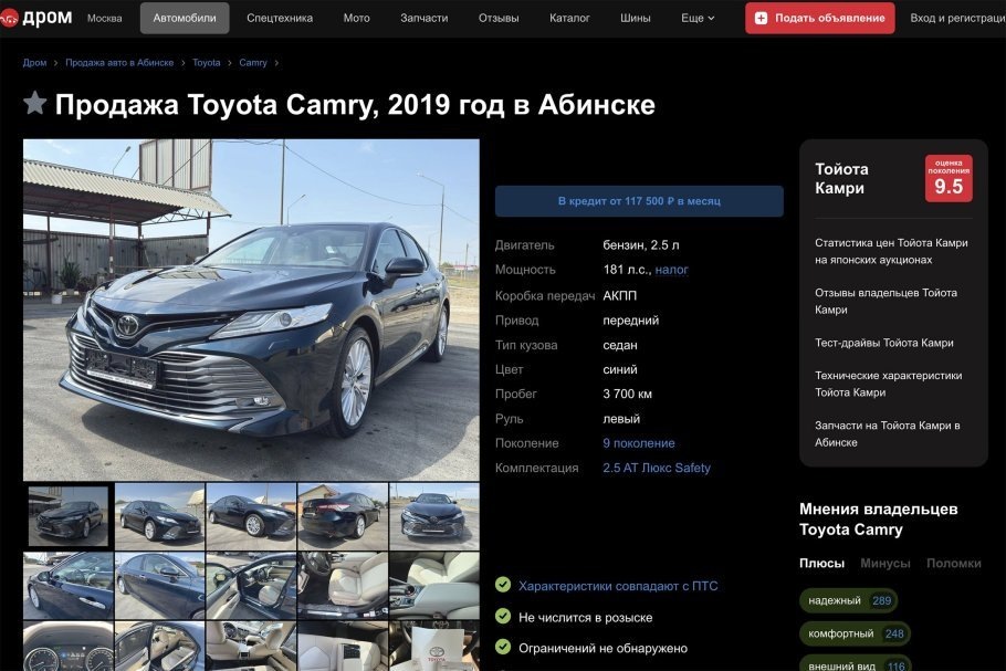 Как удалось выяснить «Российской газете», в Краснодарском крае в продаже появился уникальный седан Toyota Camry, собранный на заводе в Санкт-Петербурге в 2019 году. Автомобиль практически новый, но недешёвый.