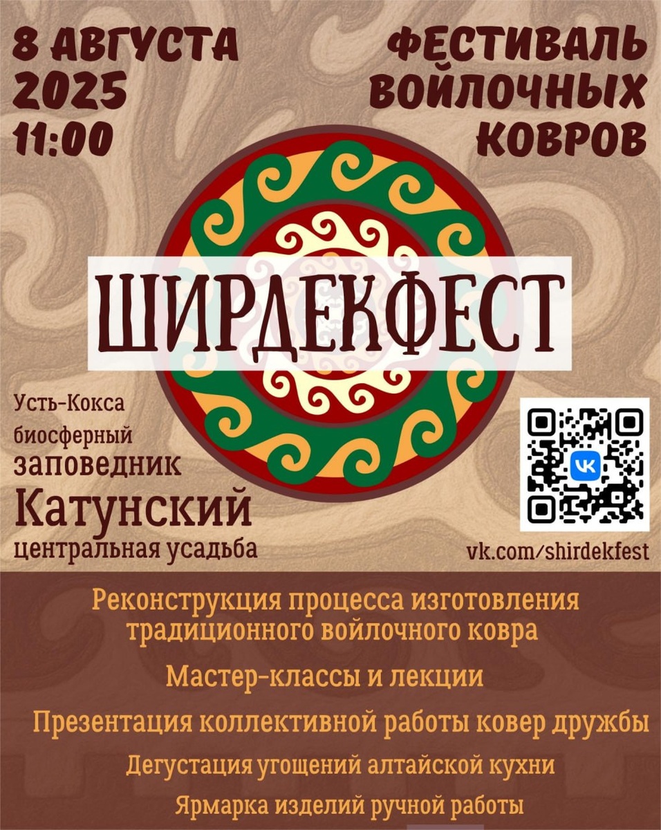 ✅8 августа в Усть-Коксе на территории центральной усадьбы Катунского биосферного заповедника состоится Первый фестиваль войлочных ковров "ШирдекФест".