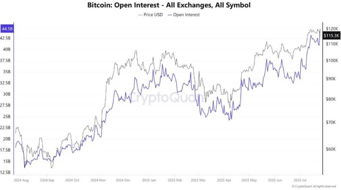 Пока цена Биткоина падает, открытый интерес достигает новых максимумов. По данным CryptoQuant открытый интерес по BTC достиг исторического максимума на фоне падения его цены, достигнув $44,5 млрд. Когда открытый интерес растёт при падении цены, это означает открытие новых торговых позиций.