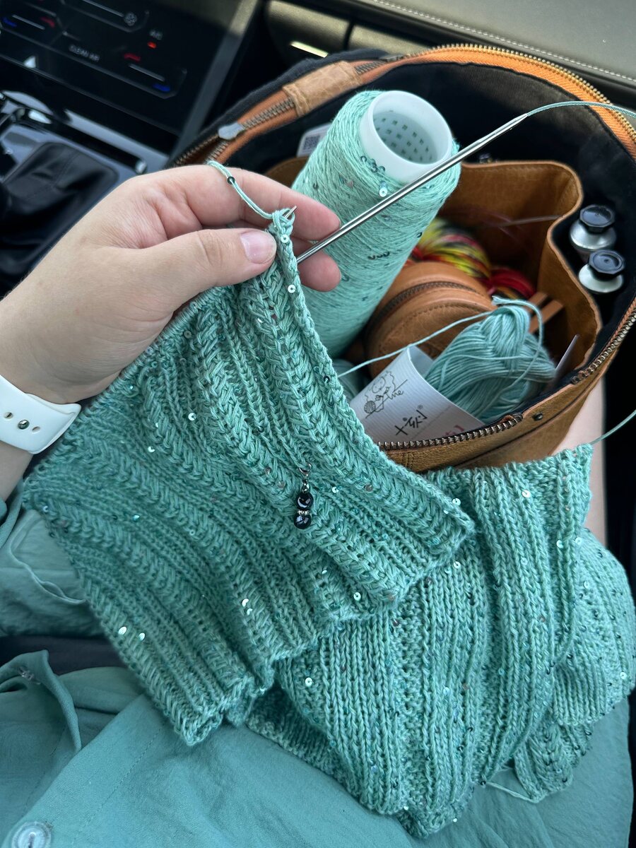 Спасибо вам за такие реакции на сорочку 🤗🥰 А мы двинулись все таки за город. Хотя для такой пробки скорее подходит слово «тащимся» 😅 Но мне-то вязать это не мешает, поэтому продвигаю своё пайеточное счастье.