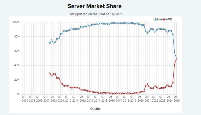 Исторический момент: впервые в истории AMD догнала Intel на рынке серверов Еще в 2017 году AMD занимала жалкие 2% рынка серверных процессоров. Сейчас — 50%. Половина. Ровно столько же, сколько у Intel. Звучит как революция? Это она и есть. Главная причина - процессоры EPYC на архитектуре Zen. Точнее, удачное стратегическое управление, которое под руководством Лизы Су превратило AMD из аутсайдера в лидера. Они сделали ставку на высокую энергоэффективность, масштабируемость, больше ядер и партнерство с TSMC. В отличие от Intel, который застрял в старом цикле с устаревшим техпроцессом, отложенными релизами и странными управленческими кульбитами. И хотя Intel обновил свои чипы Xeon, реальный рынок проголосовал за AMD: более выгодное соотношение цены и производительности, лучшее охлаждение, стабильность и уверенность в развитии. Плюс, AMD не профукала поезд под названием «ИИ», чего нельзя сказать о вечном конкуренте. Что дальше? Полный захват или новая волна конкуренции? Одно ясно то