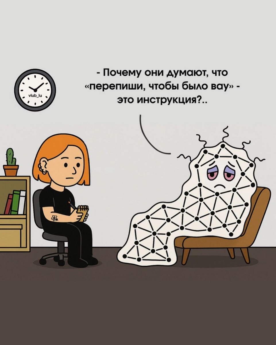 Как думаете, когда-то появятся нейропсихологи для нейросетей? Решили узнать у Дипсик, что ей приносить вместо «перепиши, чтобы было вау». Ниже ее ответ: Чтобы промт для переделки текста был максимально эффективным, в нём должны быть чёткие указания по 5 ключевым параметрам. Вот пошаговая инструкция, что включить: 1. Контекст и цель текста (Зачем переделываем? Какой результат нужен?) Примеры: 🔵Увеличить вовлечённость (лайки, комментарии) 🔵Нужно подтолкнуть к заказу 🔵Упростить технический текст для новичков 2. Аудитория (Кто будет читать? Что для них важно?) Примеры: 🔵Предприниматели 30+, ценят конкретику и экономию времени 🔵Подростки любят динамику и мемы 🔵Клиенты премиум-сегмента, ожидают экспертного тона 3. Тон и стиль (Какое настроение и язык?) Примеры: 🔵Дружеский, с юмором и разговорными фразами 🔵Строгий и профессиональный, как научная статья 🔵Вдохновляющий, как мотивационный спич 4. Структура и особенности (Как организовать текст? Что обязательно добавить/убрать?)