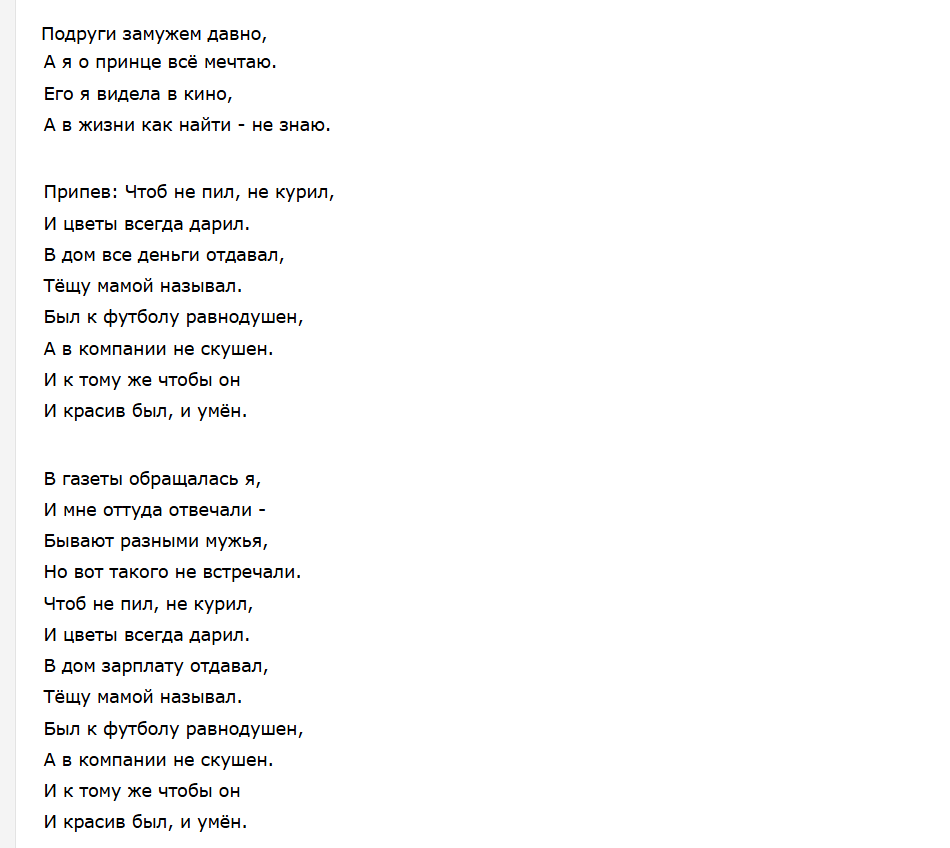 Ну что ж, я не нашла в этой песне никаких «завышенных требований». Кое-где противоречие небольшое, кое-где просто неактуально на сегодняшнее время. Еще не всем нужен полный зожник-трезвенник и ластящийся к ее маме. Но ничего ТАКОГО, из ряда вон — нет. Я считаю так. А как считаете вы, дорогие читательницы и читатели?