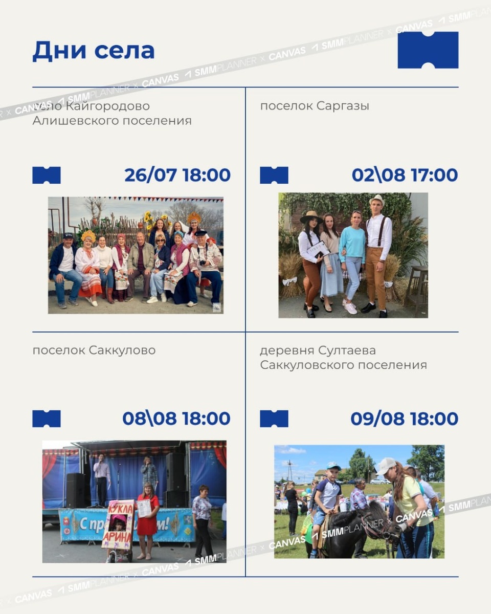 Рассказываем в каких населенных пунктах в ближайшее время пройдёт праздник День села 26\07 18:00 село Кайгородово 02\08 17:00 поселок Саргазы 08\08 18:00 поселок Саккулово 09\08 18:00 деревня Султаева Из-за погодных условий в программе возможны изменения. Следите за афишей на ресурсах «Сосновской нивы».