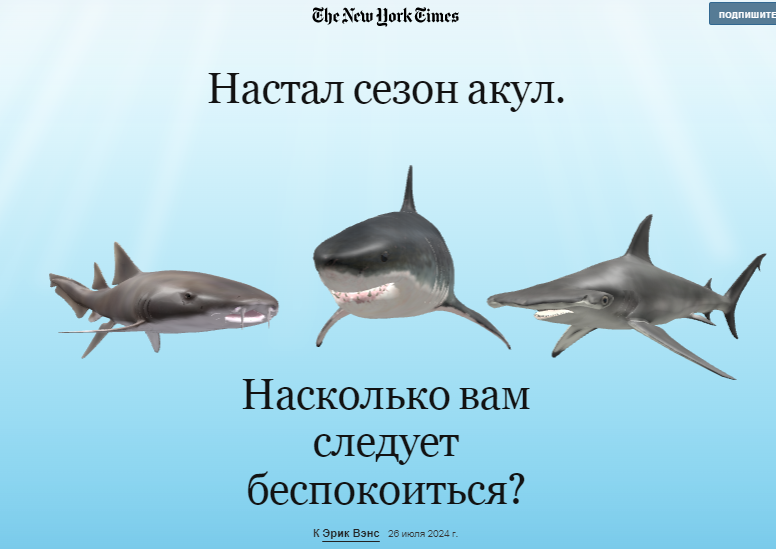 Да, подумаешь, мелочи какие. Пишет NYT Даже на Гавайях, где в последнее время зафиксировано наибольшее количество смертей от акул, вероятность утонуть как минимум в 130 раз выше, чем погибнуть от акулы. По данным Музея естественной истории Флориды , в 2023 году в США было зафиксировано всего 36 неспровоцированных нападений акул ; в результате погибло два человека. Во Флориде nfr;t зафиксировано самое большое количество укусов акул в стране. В 2023 году было зарегистрировано 16 неспровоцированных случаев (44% от общего числа случаев по стране), но ни одного смертельного исхода. Более того, с 2010 года во Флориде не было ни одного случая смерти от укуса акулы. Хотя встречи с акулами могут происходить в любое время года, их число увеличивается в середине весны и снижается поздней осенью. Наибольшее количество укусов приходится на август-сентябрь. Большинство нападений, по-видимому, совершают мелкие акулы, например, чернопёрые, которые редко наносят серьёзные травмы. Самые тяжёлые травмы н
