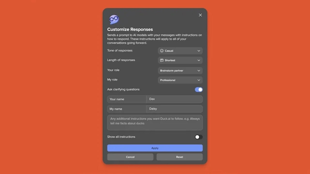 🦆✨ В DuckDuckGo появился новый настройщик личности ИИ-ассистента - теперь можно самому выбрать, как бот будет с вами общаться! Вы можете задать имя помощника, стиль ответов - например, чтобы он говорил просто или по-деловому, а ещё - давать ему инструкции, например, отвечать как пират или всегда приводить факты. Работает это прямо в браузере и приложении DuckDuckGo, а все ваши запросы остаются анонимными и защищёнными.