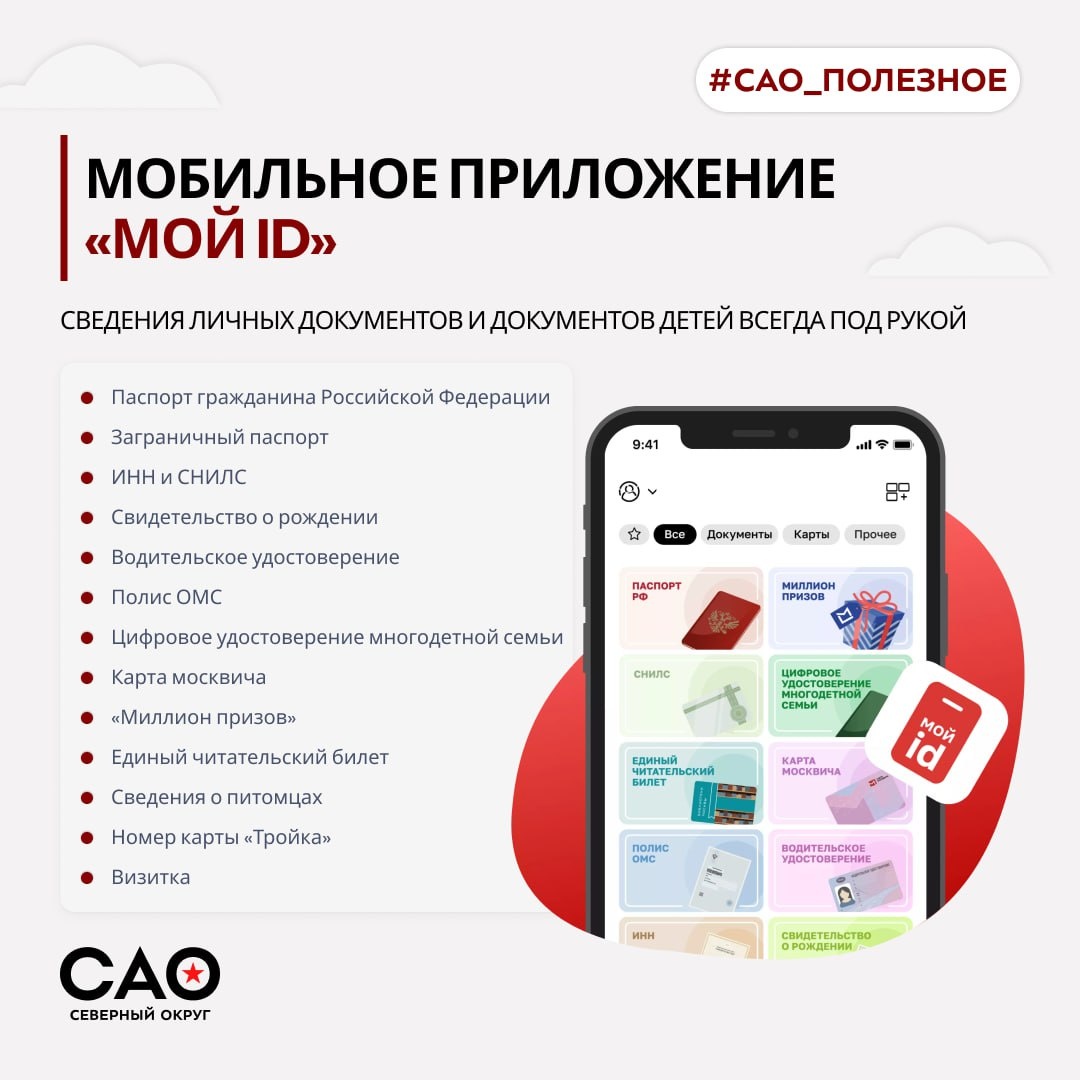 📲«Мой id» — ваши документы всегда под рукой Получать услуги в центрах «Мои документы» стало ещё удобнее с бесплатным мобильным приложением «Мой id». Все важные сведения из документов — в смартфоне, всегда под рукой. Что можно сделать с помощью приложения: 🔴Просматривать данные СНИЛС, паспорта и других документов 🔴Быстро подставлять информацию при заполнении заявлений и онлайн-форм 🔴Безопасно делиться документами с доверенными лицами 🔴Предъявить СНИЛС прямо с экрана телефона в офисах «Мои документы» — сотрудник просто отсканирует штрихкод Для использования достаточно авторизоваться через учётную запись на mos.ru. Приложение автоматически подтянет данные из городских информационных систем. Подробнее о приложении — по ссылке. 🖥 Подписывайся – Префектура САО