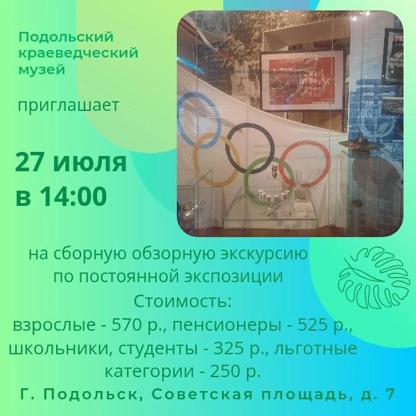 ✨ Сборную обзорную экскурсию по постоянной экспозиции! 💰Стоимость: 👉взрослые - 450 р. (экскурсионное обслуживание) + 120 р. (входной билет); 👉пенсионеры - 450 р. (экскурсионное обслуживание) + 75 р. (входной билет); 👉школьники, студенты - 250 р. (экскурсионное обслуживание) + 75 р. (входной билет); 👉льготные категории - 250 р. (экскурсионное обслуживание). 🚫 Возраст: 6+ 📆 27.07.2025 🕒 14:00 🏢 Подольский краеведческий музей 📍 г. Подольск, Советская площадь, д.7 #webПодольск ⭐Разместить публикацию ⭐Поддержать канал голосом 💰 Стань курьером в Подольске – твой доход, твое время! ✅ Мероприятия Подольск https://dzen.ru/id/66ed500f7b5671493eca3fd6 http://vk.com/podolsk_events http://dzen.ru/podolsk_events