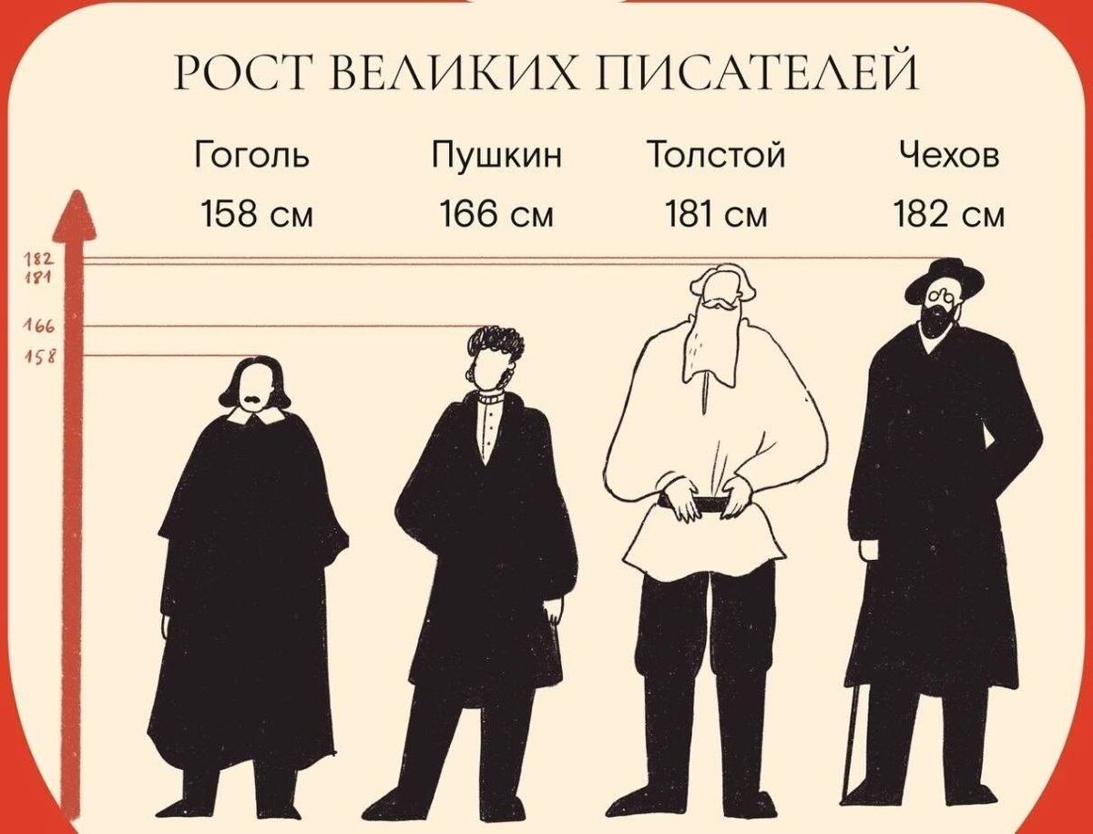 А вы знали? КАКОГО РОСТА БЫЛИ РУССКИЕ КЛАССИКИ ? 📈 Самым высоким был Тургенев — 190 см. 📈 Чехов и Толстой — около 180 см. 📉 Пушкин и Достоевский — не выше 170 см. 📉 Гоголь — 158 см. 📊 Среди писателей 20 века: 📈 Горький, Маяковский и Пастернак — под 190 см. 📈Булгаков и Есенин — около 170 см. 📉 Цветаева — 163 см, а Ахматова — 177 см