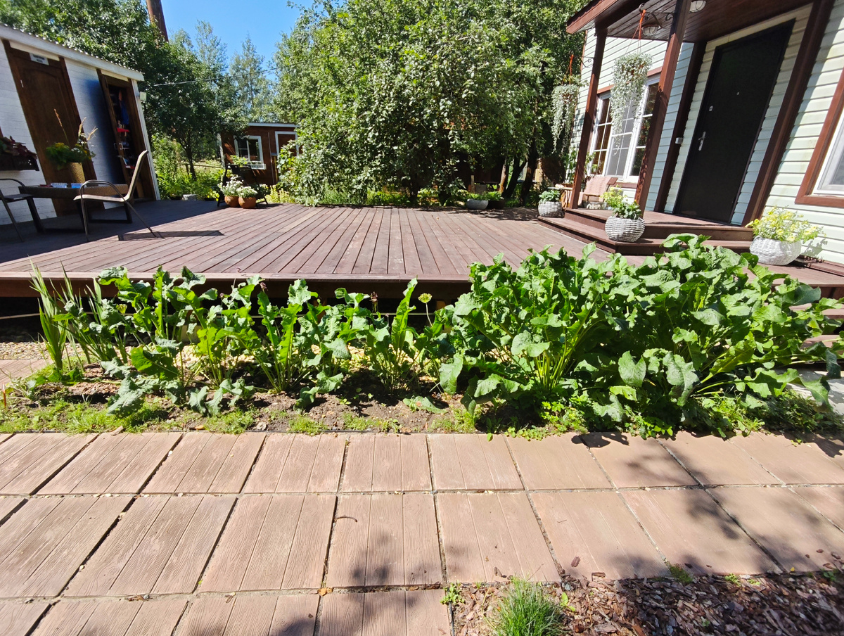 Я не сторонник борьбы с нашим неблагодатным климатом, патогенным микроклиматом, и глинобетоном, изображающим почву - КПД стремится к нулю. Да и лень ) Семья у нас - я да муж, у моих родителей и его сестры - свои угодья. Так что объем выращиваемого съедобного у меня чисто "на зубок". И ничего не растет в базовом открытом грунте - все в высоких грядках, кашпо, горшках и даже мешках, с "мешочным" же покупным грунтом. Дорого, отчасти потому и мало. В родной земле растет из условно-съедобного только хрен ) Он рос тут испокон веков, и, случайно оказавшись к месту, стал выполнять декоративную функцию - прикрыть ноги террасы. Ему была оставлена длинная полоса, ограниченная со всех сторон - ползти некуда, хотя я не удивлюсь, если он пролезет под плиткой в соседнюю клумбу. Тот, что выше - это старикан, далее заполняла длину молодежью, откопанной на заброшке. Пока разрастаются, в следующем году должно всё выровняться и обрести конечный вид. Матёрый уже ложится на доски своими листьями Конечно, к