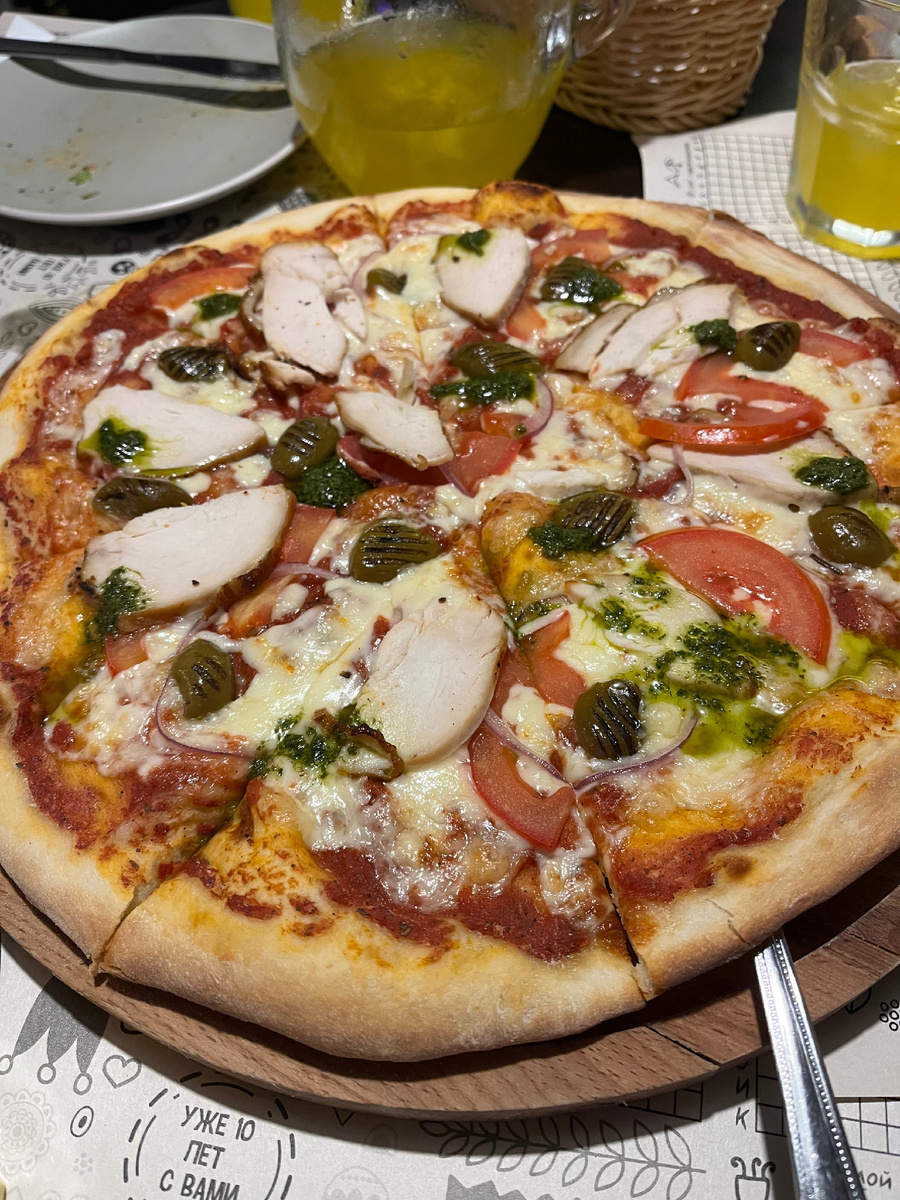 Вчерашний ужин Всё таки сестра решила праздновать день рождения! Так бывает, иногда не хочется отмечать, а иногда хочется. На свой день рождения она ездит к дочери который год, а потом уже позднее отмечает с друзьями и на работе. Короче, празднование продолжается. Вот мы и пошли в то кафе,куда заходили днем ранее, только тогда была разведка ужином 😃, а вчера уже само мероприятие! Там и мероприятием сложно назвать, проще сказать —сообразили на троих. 😃😃 Но зато погурманили. Заказали новую пиццу, для нас , с новым вкусом, сестре даже понравилось больше. Пицца с копченой курицей, соусом песто и свежими томатами. Взяли куриный паштет с черносмородиновым джемом и гренками из белого хлеба . Теплый салат с кальмарами, кабачками, свежими огурцами и апельсиново-ореховым соусом. И вид эстетичный и вкусно! Я по мясу 😃😃хоть и куриному. У меня куриный шашлык на лепешке. У подружки был греческий салат . Это только я траву не ем, мне мясо подавай 😃😃 Пили мы напиток из маракуйи и апел