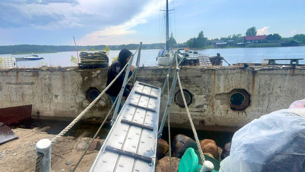 Чтобы добраться до яхты пришлось снять с бетономешалки повисший на ней унесенный ветром трап.