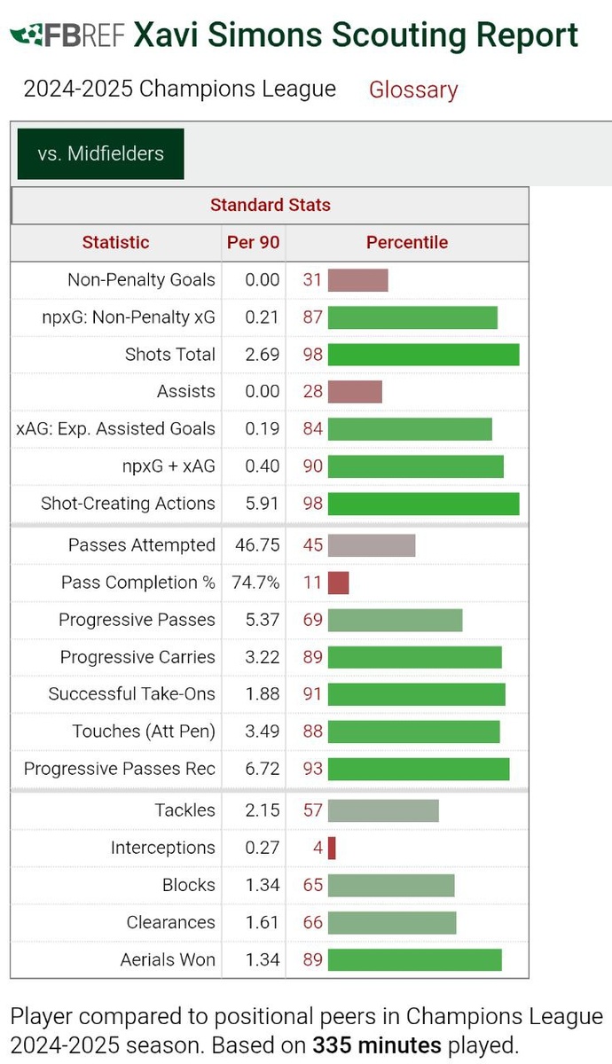 В ответ на пост Хави Симонс может перейти в "Челси". Креативная машина Начало здесь Симонс — это парень, который создает моменты из ничего. Смотрим на его стату в самом конкурентном турнире мира — ЛЧ — и просто кайфуем. Почти все показатели, связанные с креативом, у него на элитном уровне. ➡️ Shot-Creating Actions (действия, создающие удары): 98-й процентиль. Он делает больше подготовительной работы к ударам, чем 98% полузащитников. Космос. ➡️ npxG + xAG (Ожидаемые голы + ассисты без учета пенальти): 90-й процентиль. Постоянно находится в центре событий и либо бьет сам с опасной точки, либо выводит на удар партнеров. Дриблинг и продвижение мяча Этот парень просто обожает мяч. Он не из тех, кого назовут "метрономом". Не будет просто по диагонали отдавать пасик и стоять дальше на месте. Он тащит мяч вперед, не боится идти в обводку и накручивать соперников. ➡️ Successful Take-Ons (успешные обводки): 91-й процентиль. ➡️ Progressive Carries (продвигающие проходы с мячом): 89-й про