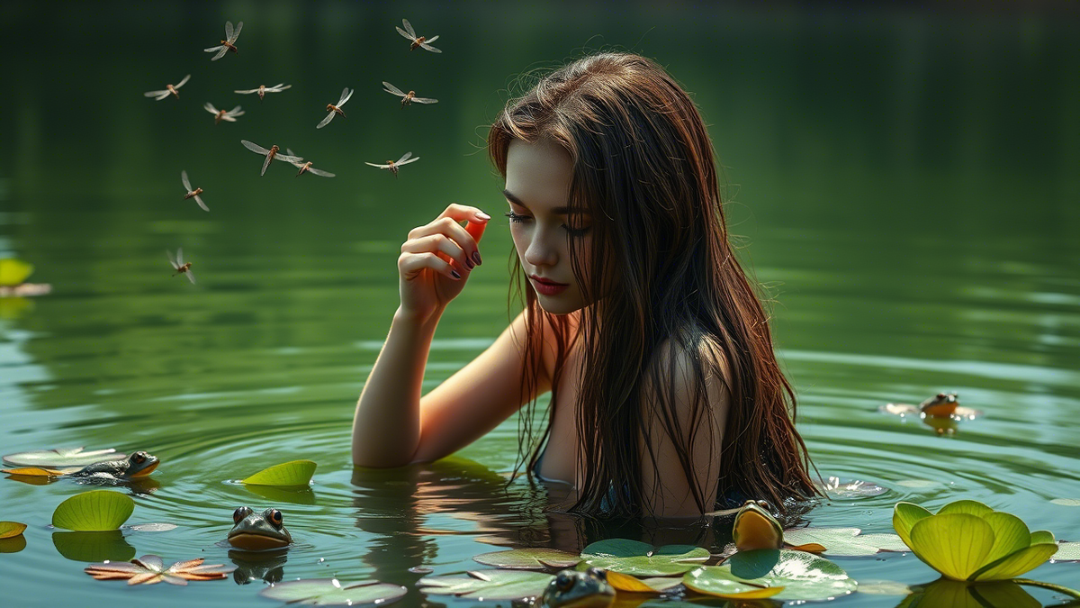 Над озерцом кружили стрекозы. Девушка сидела в воде, расчёсывая длинные мокрые волосы пальцами и слушала песни лягушек, что прятались среди кувшинок. Жаркий денёк нагрел воду. Сделав её горячей, как парное молоко. Красавица бултыхнула ножкой, поднимая ил со дна, вытащила её из воды, растопырив пальцы, оглядела розовую пятку. Невдалеке у тропы платье из крапивы висело на ветке старого дерева, склонившегося кроной к воде. Девица не смотрела в его сторону и потому не заметила, как, тихо ступая, по дорожке прокрался лощёный юноша с насмешливым взглядом. Он наблюдал за ней из-за густой листвы, жадно ловя каждое движение взглядом, пытаясь разглядеть, что скрывает помутневшая гладь воды. Но робеть и смущаться юноша не привык. Он ловко подхватил платье и вышел из укрытия. - Эй, красавица, - окликнул он её. Девица обернулась. Удивление и испуг отразились на её лице. - Что такая юная беззащитная девушка делает посреди ведьминого леса вдалеке от селений? – спросил он ехидно. – Неужто стесняется п