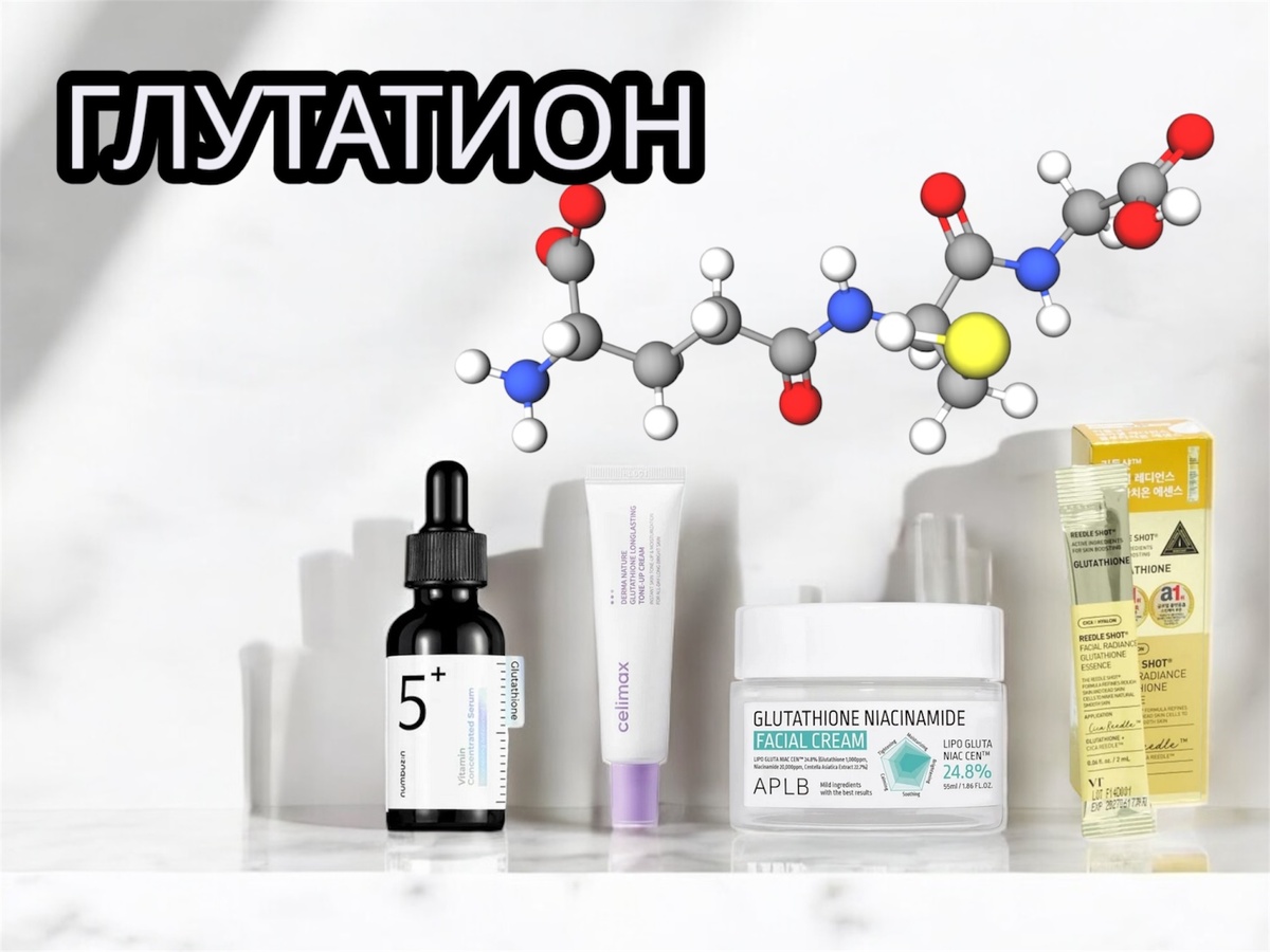Глутатион — трипептид, состоящий из 3 аминокислот (глутамат, цистеин и глицин), который содержится в коже человека. Но как это часто бывает, с возрастом он вырабатывается медленнее, поэтому косметика - нам в помощь.