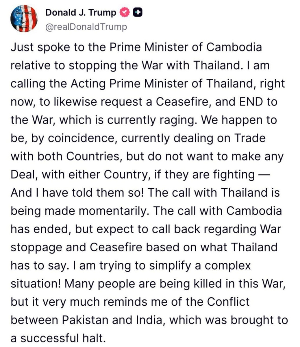 Trump is trying his hand at 'making peace' again Says he will not be making 'Deals' with either Cambodia or Thailand while the conflict is going on 'I am trying to simplify a complex situation'