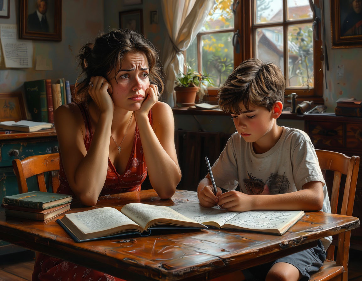 Вернувшись домой, она застала Диму за уроками. Он сидел за столом, освещённый тусклой лампой, и старательно выводил буквы в тетради, сосредоточенно нахмурив брови. На столе лежали потрёпанные учебники, рядом с ними старая мягкая игрушка котика, с которой мальчик не расставался с рождения.