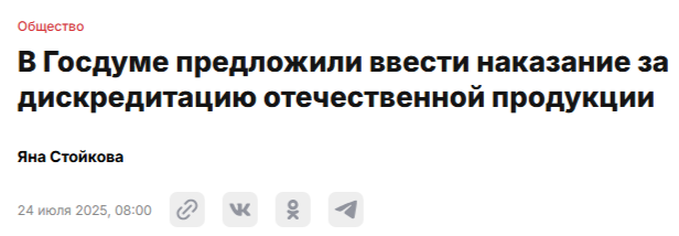 Что еще такого придумать, чтобы заставить россиян покупать дорогие и низкокачественные товары собственного производства? "А давайте запретим их ругать, а тех, кто ругает - будем штрафовать!", - предложил народный избранник из партии "Справедливая Россия" Николай Новичков. Этот депутат считает необходимым запрет общественного порицания абсолютно всего российского: производителей, конкретных товаров и брендов. Потому что дело это, цитирую, "не патриотичное и не народное". Процитирую полностью это предложение, которое приводит издание "Абзац" (тут всего один абзац, но какой, я бы сказал, это просто полный абзац!). Нужно вводить штрафы за дискредитацию российского производителя и российского производства, потому что это дело, конечно, далеко не патриотичное и не народное. Люди должны понимать, что приоритеты российского производителя должны быть абсолютными во всем: и в потребительских товарах, и в средствах производства. Поэтому необходимо проработать вопрос административной ответственнос