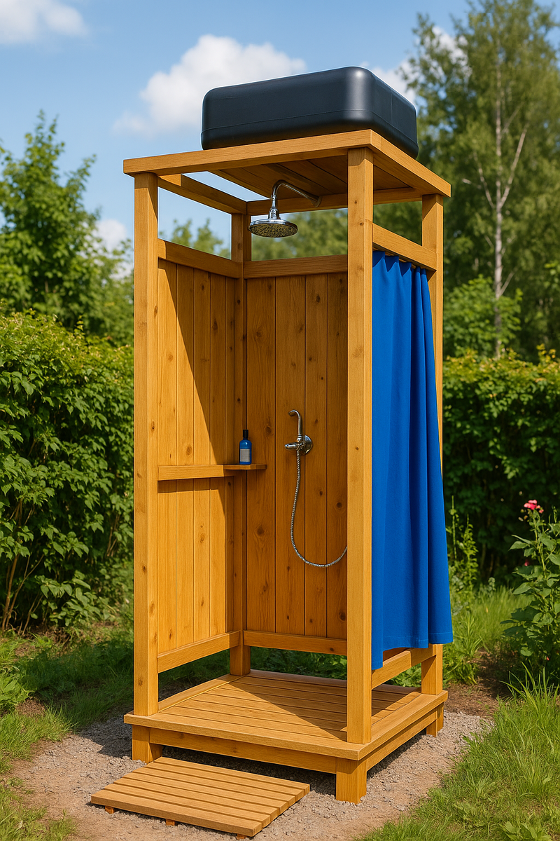 ✅ Просто удовольствие — принимать душ под открытым небом! Лучше всего — солнечное, но слегка прикрытое от ветра. Так вода в баке быстрее прогреется, а вам будет комфортнее. Самый простой вариант — деревянный поддон из досок с зазором для стока воды. Можно уложить тротуарную плитку или сделать пол из гравия, чтобы вода уходила в грунт. Летний душ можно собрать из: Высота каркаса обычно около 2 м. Важно, чтобы он выдержал бак с водой (а это 100–200 л, значит вес — до 200 кг). Популярный вариант — пластиковый бак чёрного цвета: он быстро нагревается от