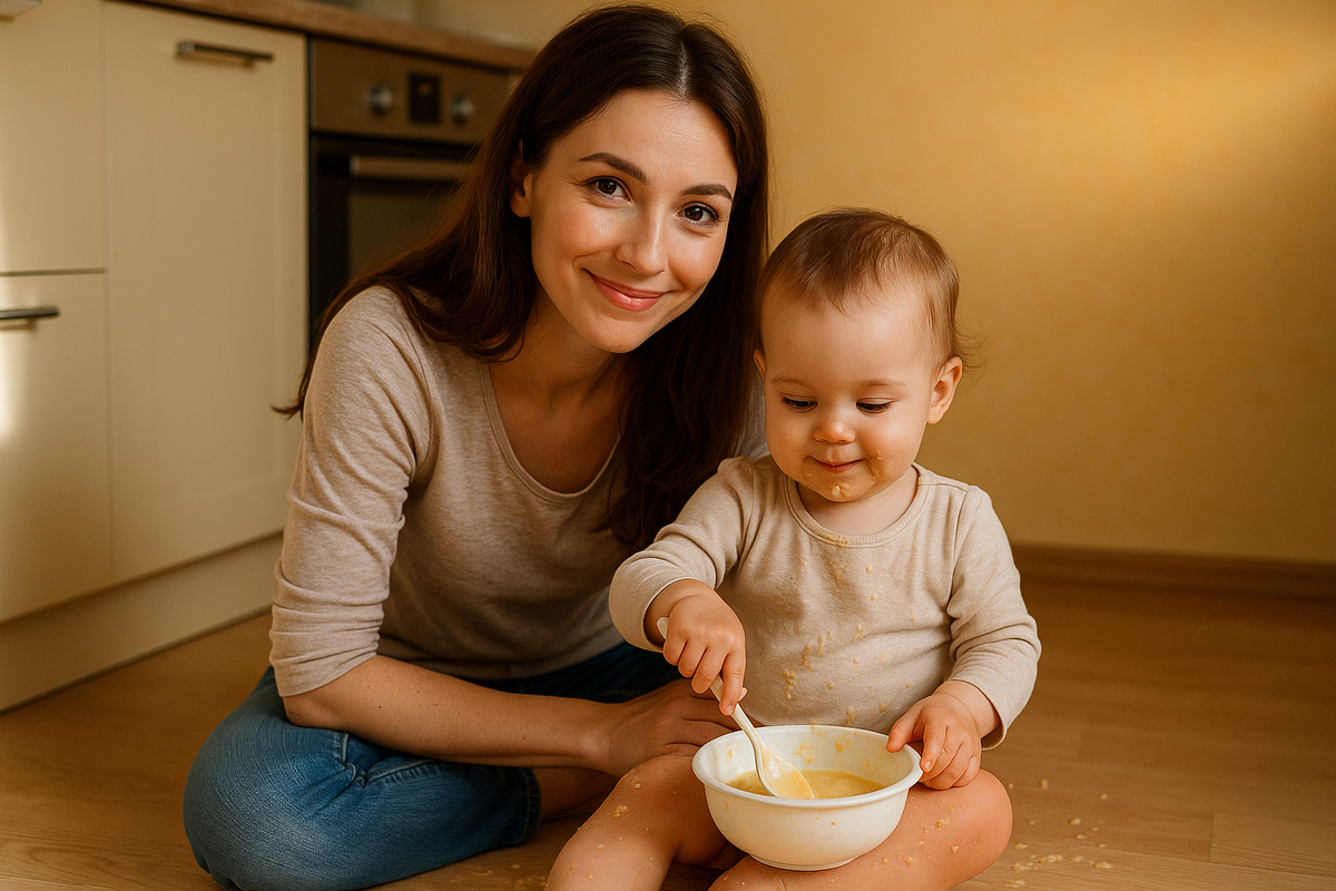 Пример из жизни: София в 11 месяцев вылила на себя пюре, потому что хотела есть "сама". Месяц я отмывала кухню после каждого кормления!