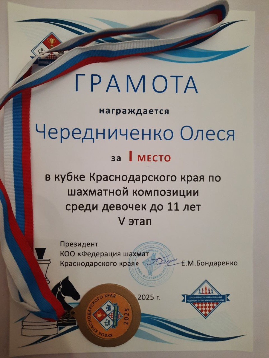 Не успеваю выкладывать результаты наших учеников. Поэтому немного потерпите эти дни, пока мы всех детей поздравим))) Поздравляю Олесю Чередниченко с 1 местом в кубке Краснодарского края по решению шахматной композиции! 🎉🔥👏 Мы тобой гордимся и ждем новых больших побед!!!