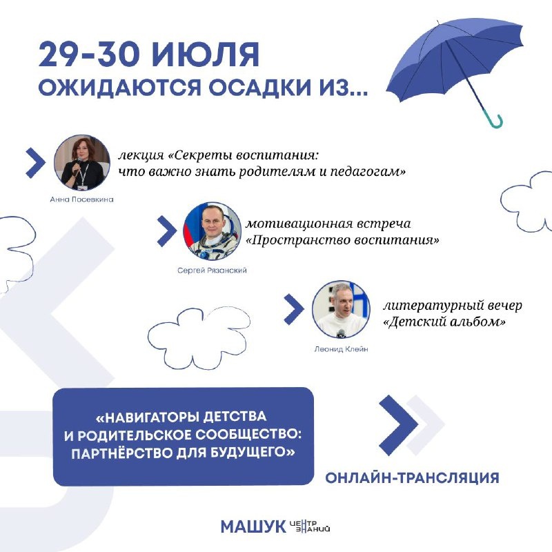 👩🏫Включаемся в главное событие о воспитании! 29–30 июля стартует совместная с Росдетцентром онлайн-программа «Навигаторы детства и родительское сообщество: партнёрство для будущего» — для тех, кто работает с детьми, строит доверие между школой и семьёй и ищет реальные, работающие решения. Два дня, три включения — о том, как выстраивать партнёрство, делиться опытом и говорить на одном языке в интересах детей. В программе: 👉29 июля | 16:00–17:30 Лекция «Секреты воспитания: что важно знать родителям и педагогам» с Анной Посевкиной, эксперт Созвездия Флагманы образования, заместитель директора школы 1391, лектор общества «Знание». 👉30 июля | 14:30–16:30 Мотивационная встреча «Пространство воспитания» с Сергеем Рязанским, космонавтом, Героем России, автором книг 👉30 июля | 21:00–23:00 Литературный вечер «Детский альбом» с Леонидом Клейном, филологом, педагогом, лектором 📌Кому будет полезно: Советникам директоров по воспитанию, учителям, региональным и муниципальным координат